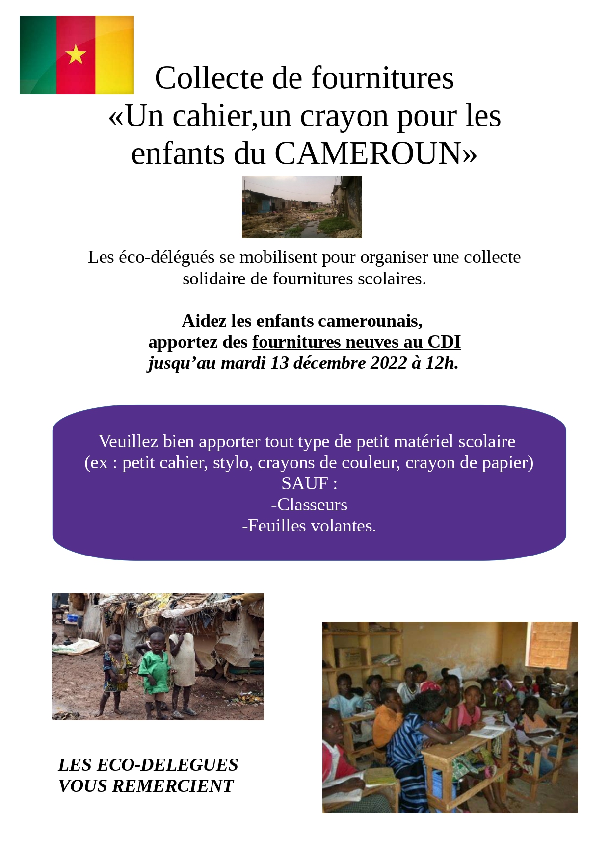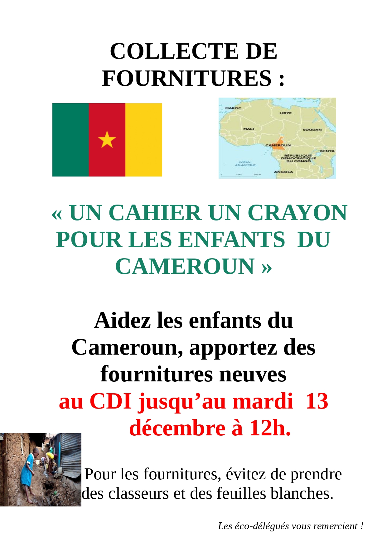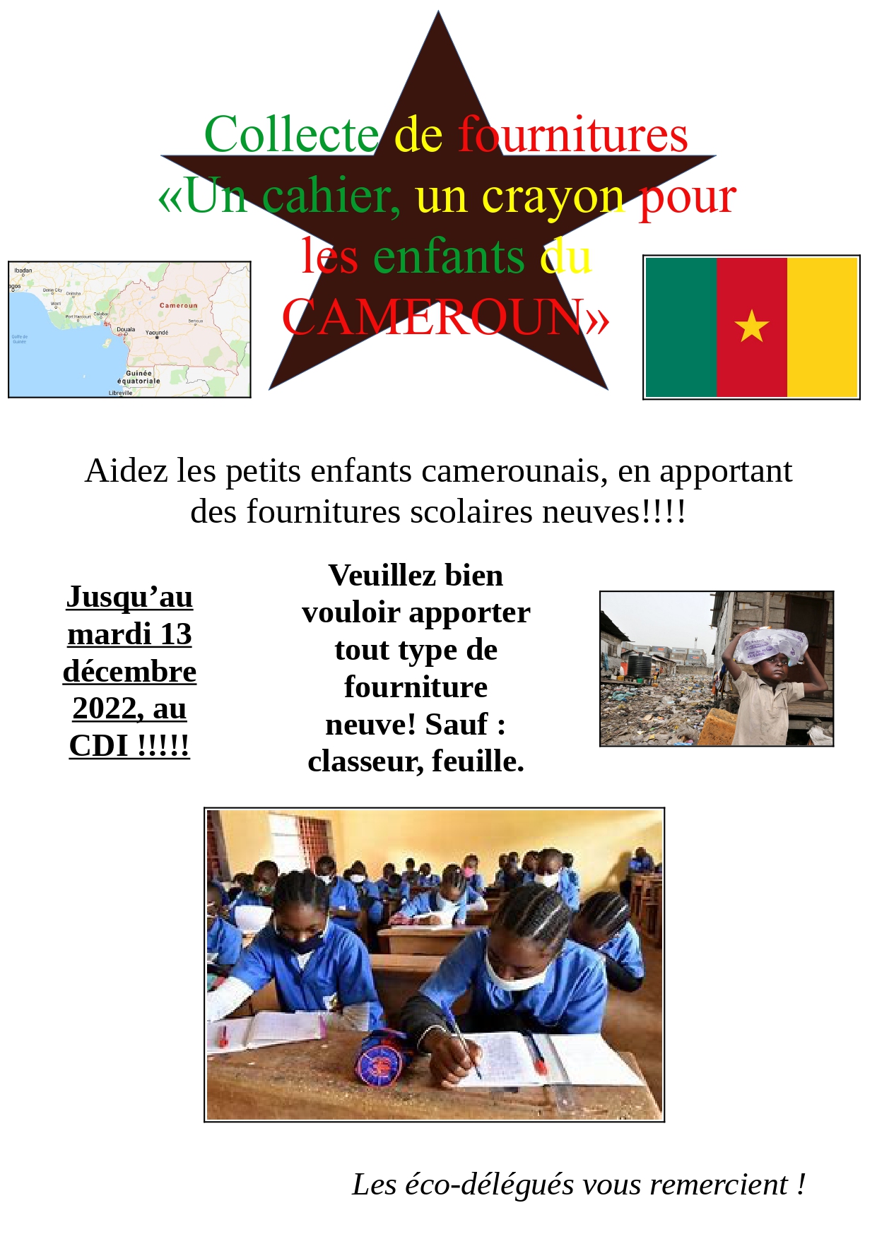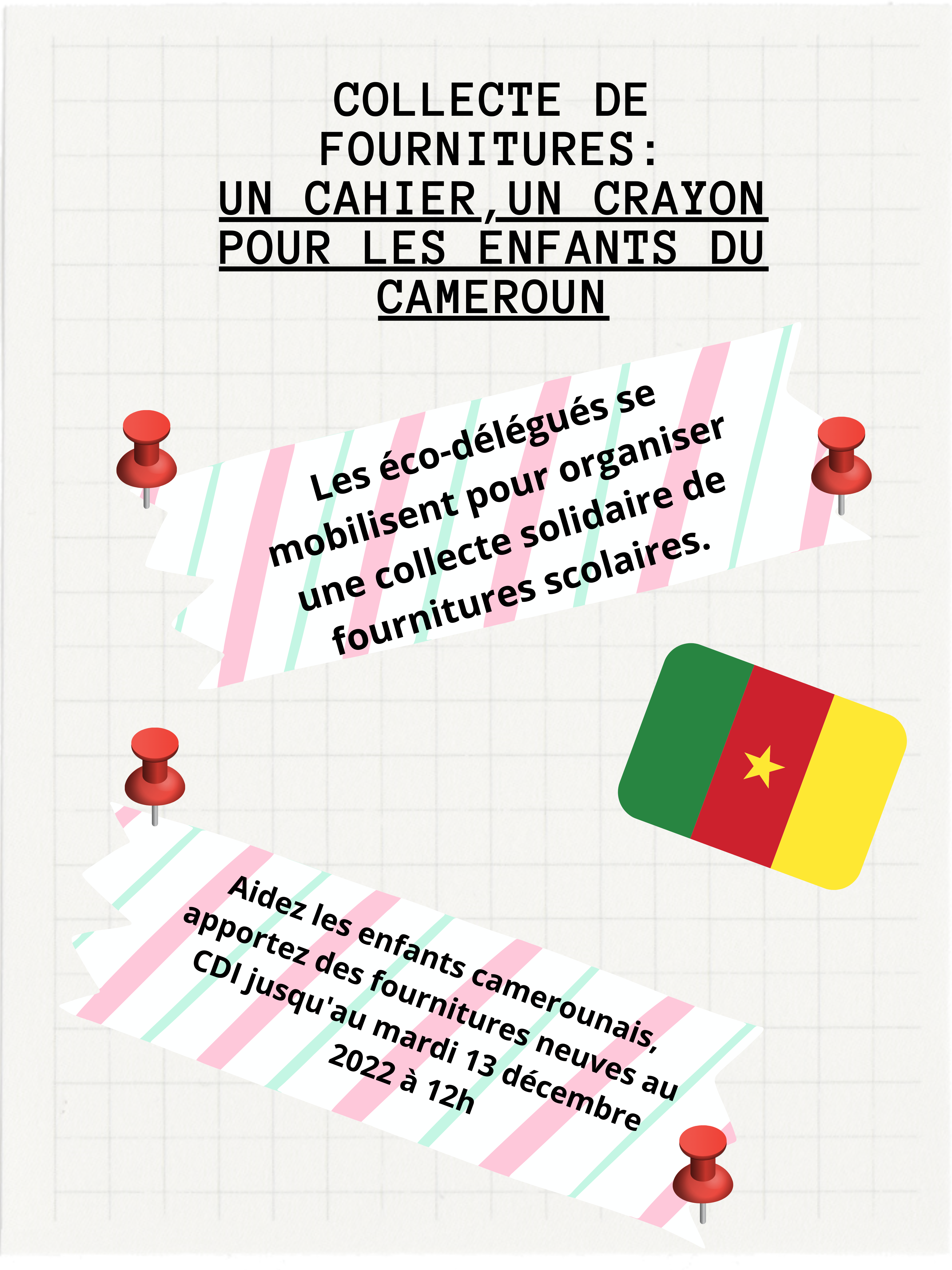 Les élèves de 6e2, 5e1, 5e3, 5e5 et les éco-délégués se mobilisent pour la collecte de fournitures "Un cahier, un crayon pour les enfants du Cameroun". Vous pouvez apporter des fournitures neuves (de type petit cahier, stylos, crayons) au CDI jusqu'au mardi 13 décembre à 12h.