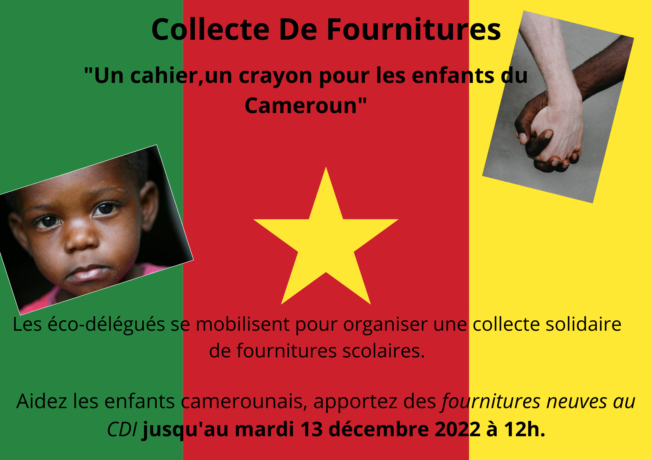 2022-2023 Collecte de fournitures scolaires pour le Cameroun Les élèves de 6e2, 5e1, 5e3, 5e5 et les éco-délégués se mobilisent pour la collecte de fournitures "Un cahier, un crayon pour les enfants du Cameroun". Vous pouvez apporter des fournitures neuves (de t ...